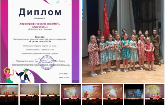 27 октября хореографический ансамбль "Анастэль" ДШИ № 3 г. Владимира под руководством Джгамазия Анастасии Юрьевны принял участие в дистанционном Международном конкурсе хореографического искусства "В ритме танца 2025" (г. Москва).