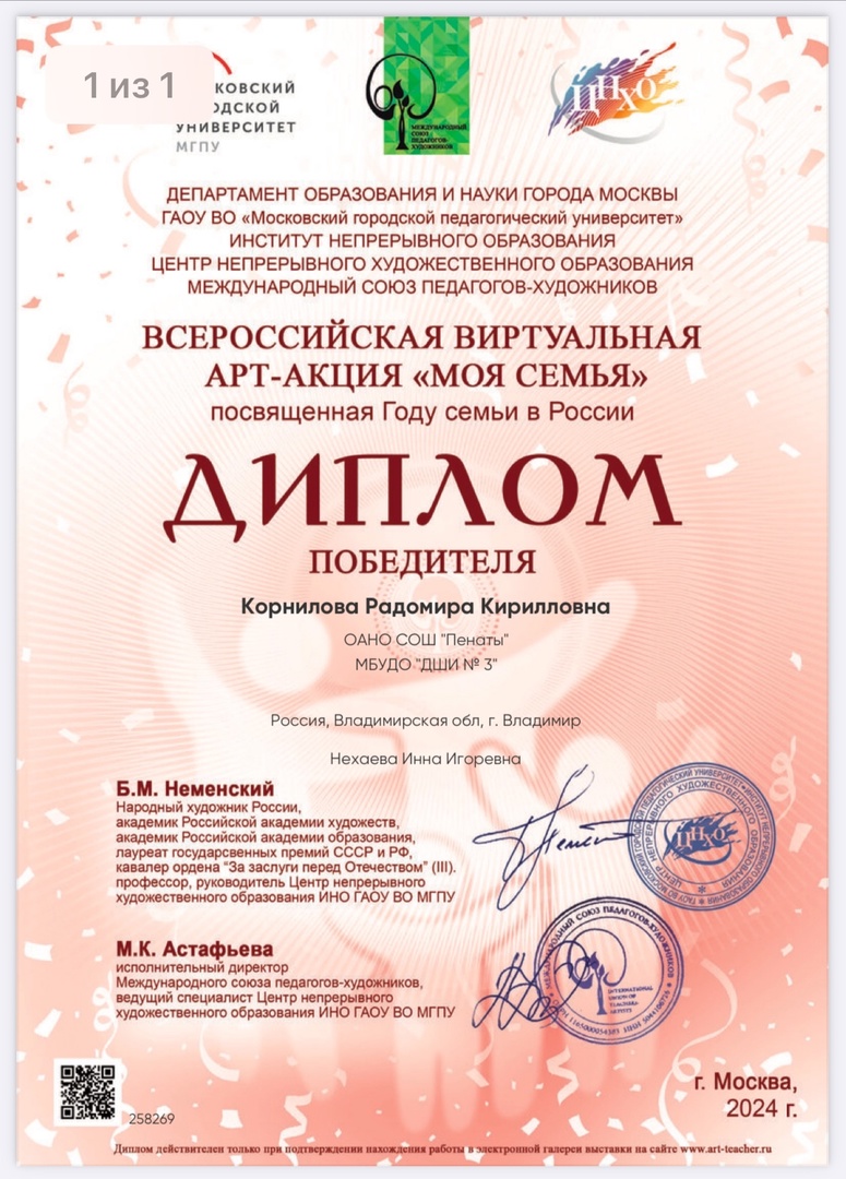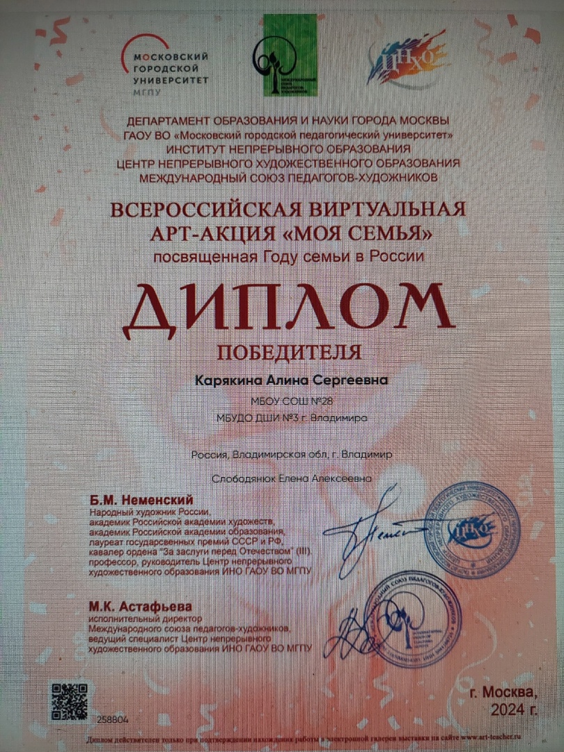 По итогам художественной Арт-акции «Моя семья», посвященной Году семьи в России, организаторами которой выступили Московский городской педагогический университет, Центр непрерывного художественного образования МГПУ, Международный союз педагогов-художников, в число лучших работ вошли рисунки учащихся ДШИ № 3 г. Владимира.