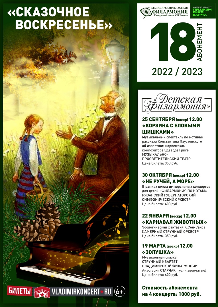 Проект «СКАЗОЧНОЕ ВОСКРЕСЕНЬЕ» - это хороший повод посетить филармонию всей семьёй, насладиться прекрасной музыкой и устроить настоящий семейный праздник! Для данного цикла мы специально подобрали программы, которые придутся по вкусу как взрослым, так и маленьким, как искушенным знатокам, так и начинающим меломанам. А дневное время концертов позволит родителям не беспокоиться о нарушении детьми режима дня.