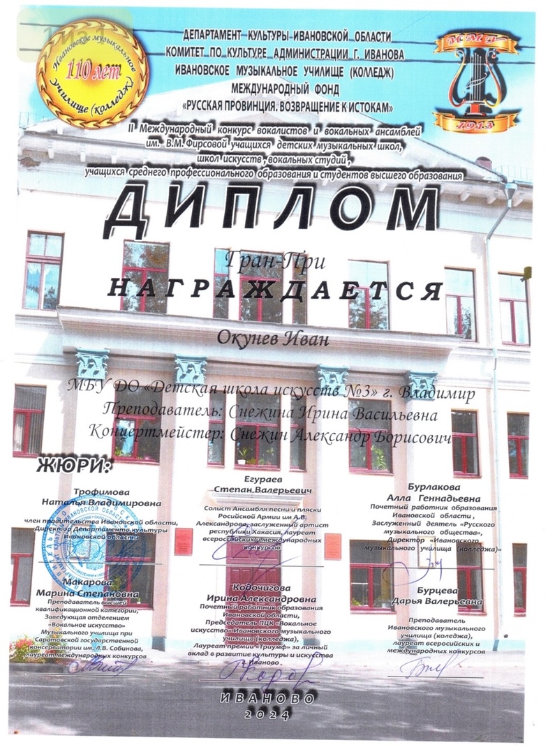 Окунев Иван – диплом Гран-При (преподаватель Снежина И.В., концертмейстер Снежин А.Б.)