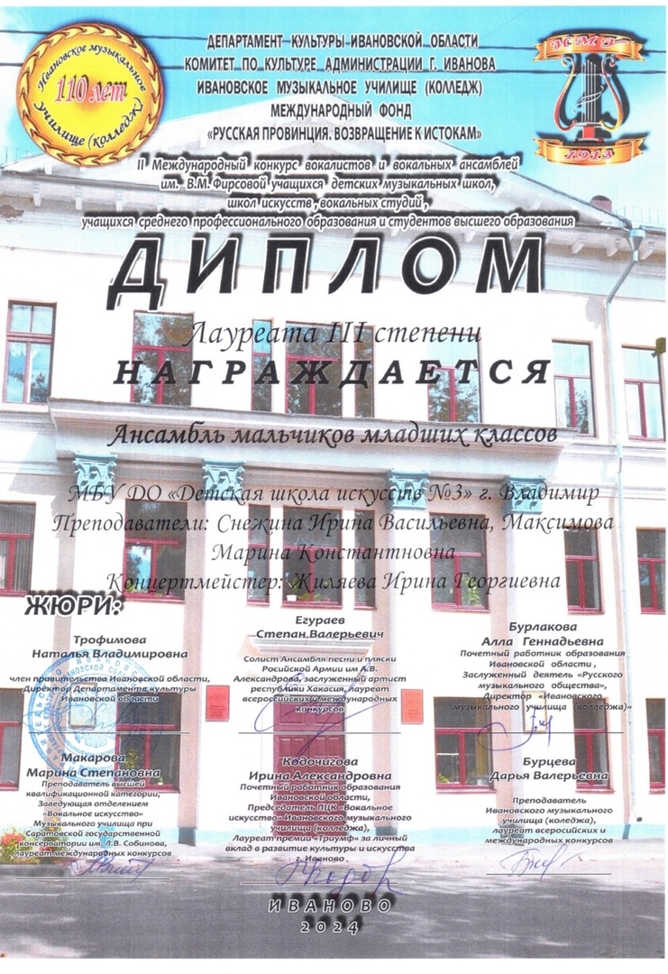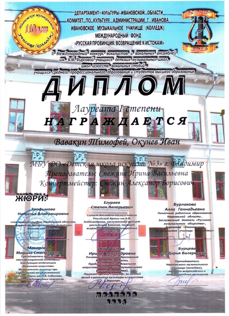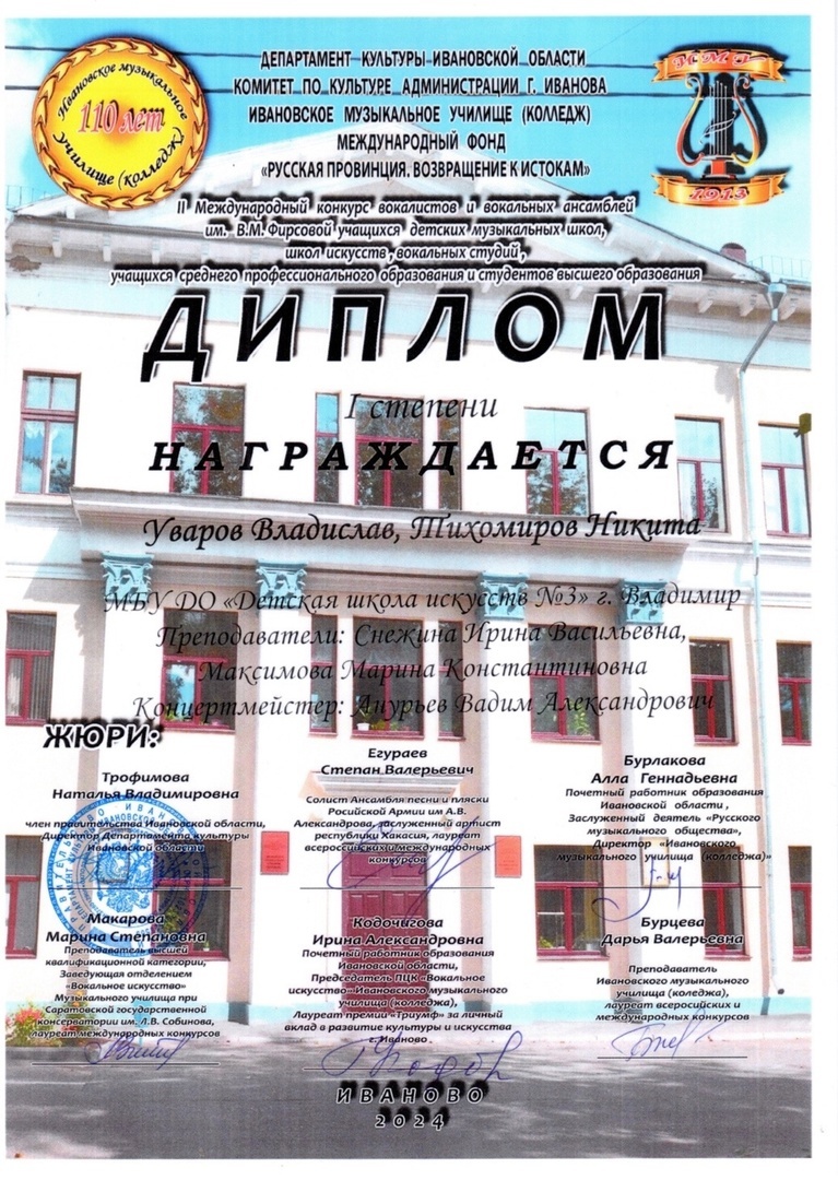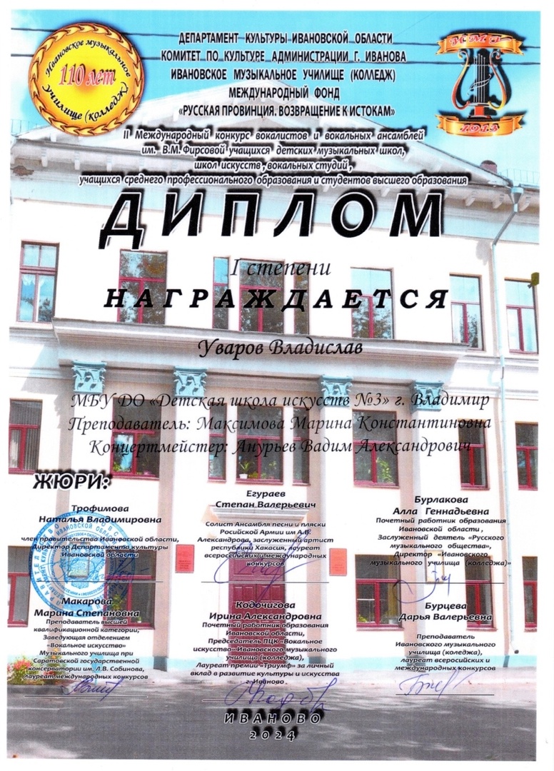 12 апреля 2024 года в Ивановском музыкальном училище (колледж) прошёл II Международный конкурс вокалистов и вокальных ансамблей им. В.М.Фирсовой учащихся детских музыкальных школ, школ искусств, вокальных студий, учащихся среднего профессионального образования и студентов высшего образования.