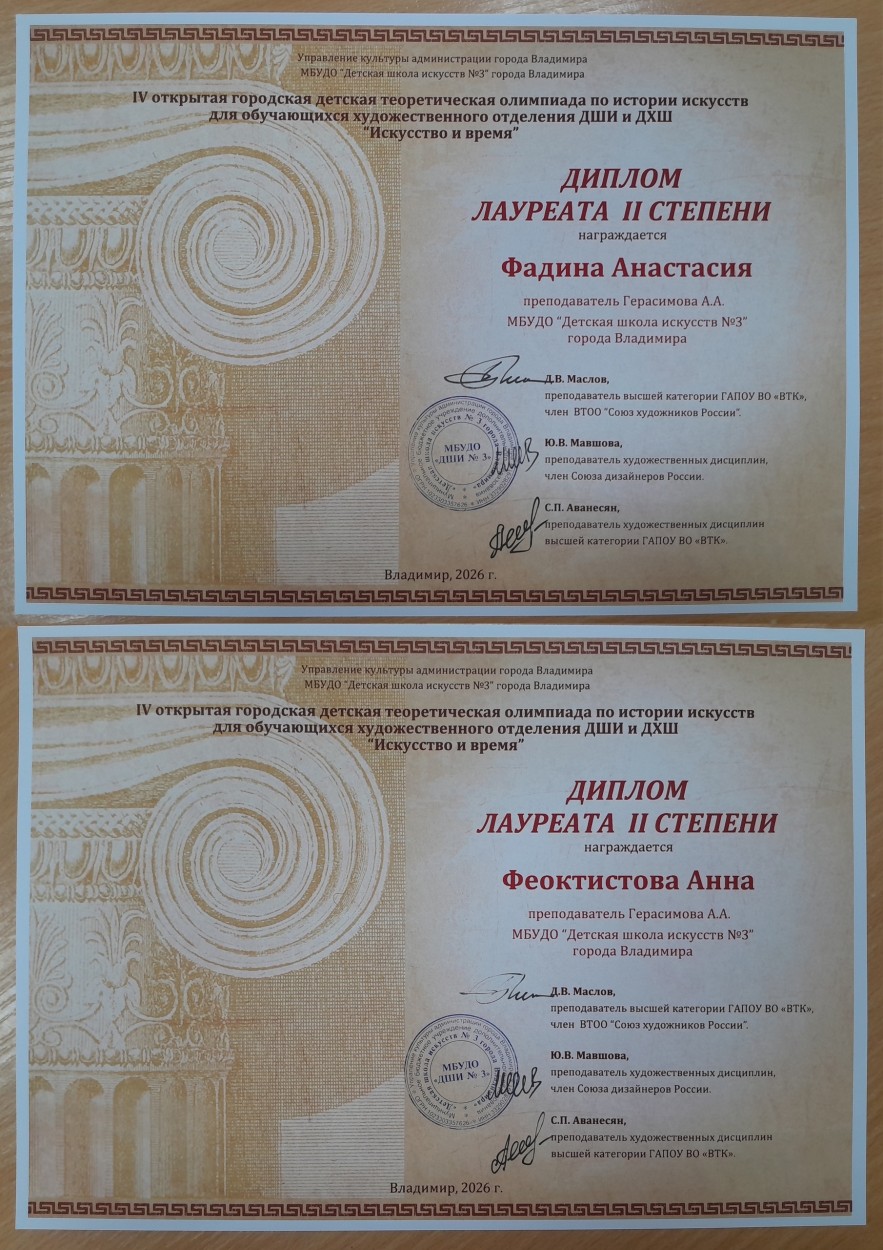 - Фадина Анастасия и Феоктистова Анна ( преп. Герасимова А.А.) - лауреаты II степени.