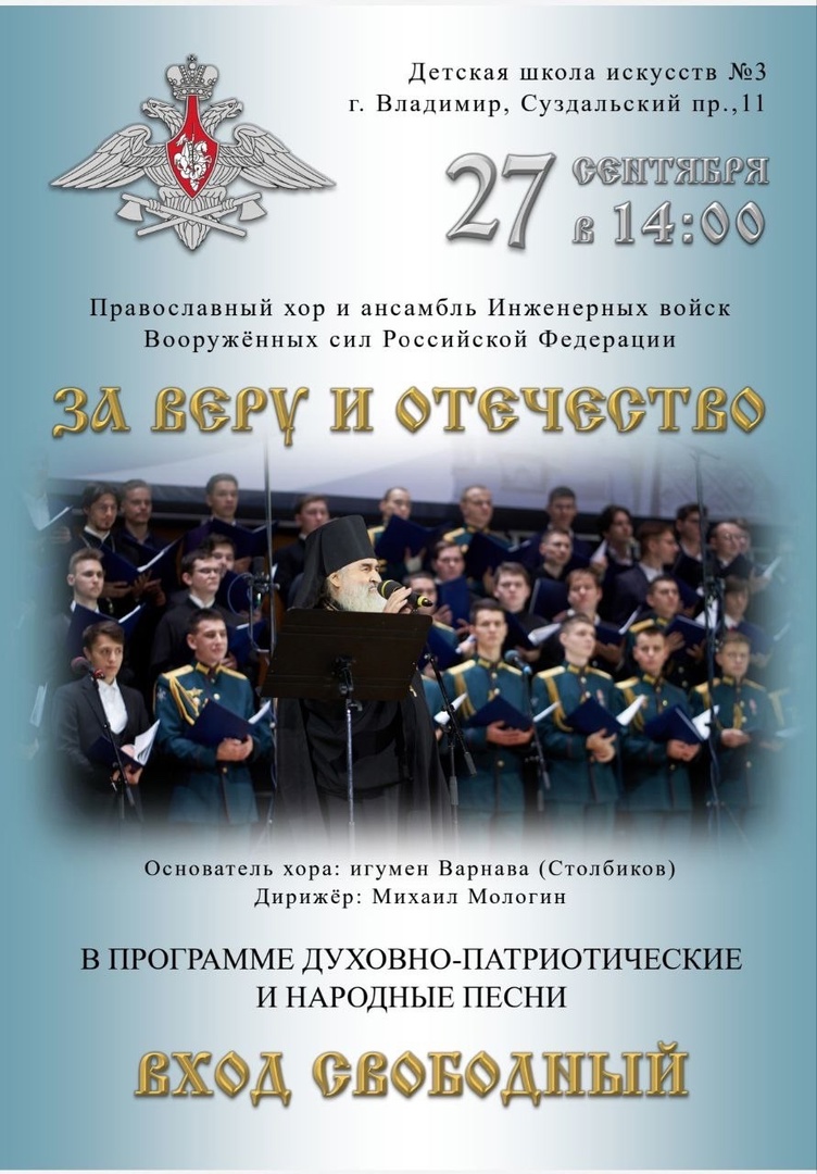 27 сентября в 14.00 в большом зале состоится концерт православного хора и ансамбля Инженерных войск Вооружённых сил Российской Федерации "За Веру и Отечество"