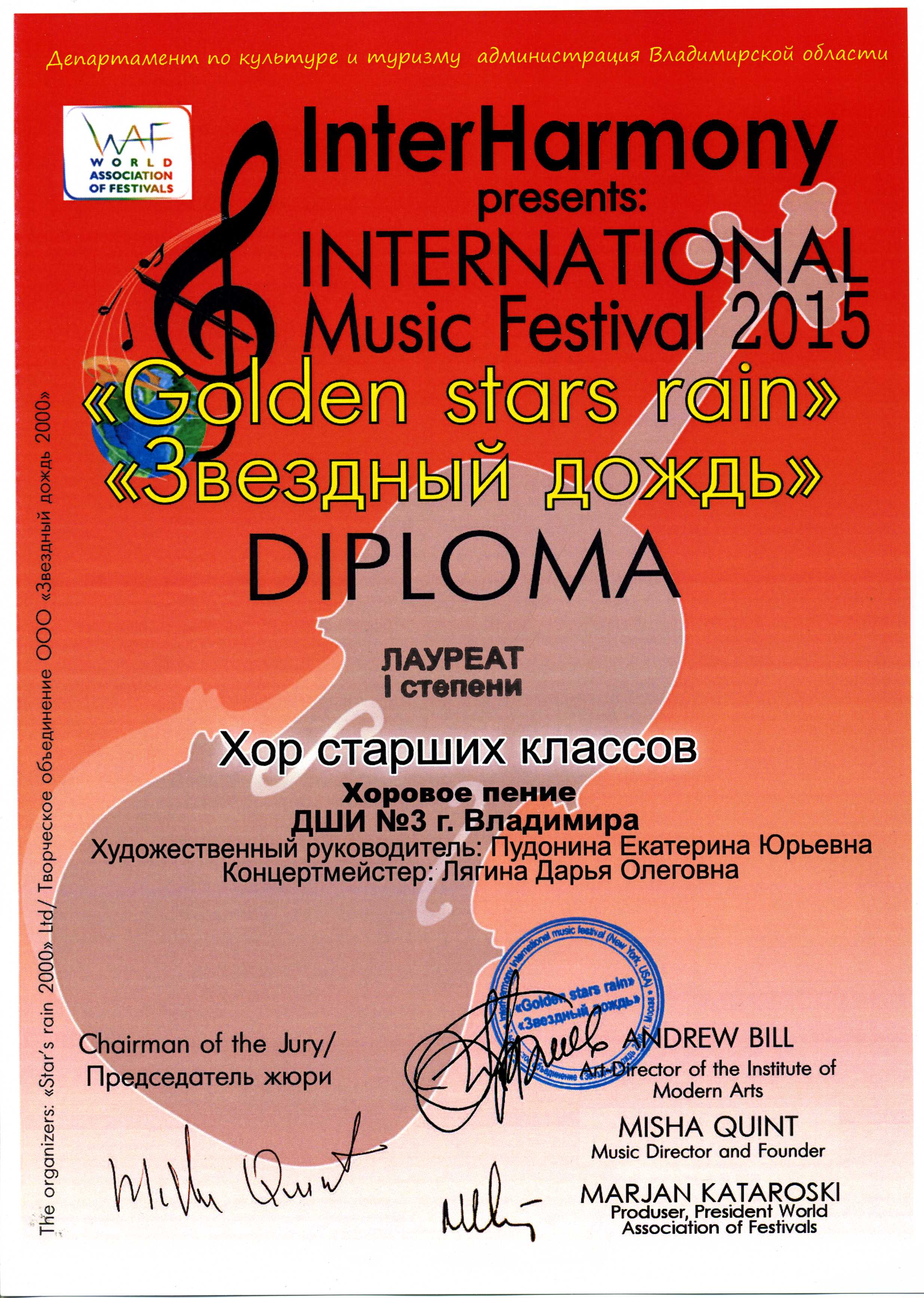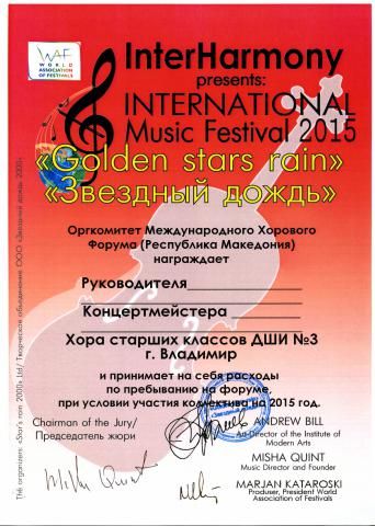 19 февраля 2015 года в г. Суздале состоялся Международный фестиваль-конкурс «Звёздный дождь». С большим успехом на этом конкурсе в номинации «Академическое хоровое пение» выступил концертный хор старших классов ДШИ №3 г.Владимира. За исполненную программу хор был удостоен диплома лауреата I степени. Жюри также присудило хору диплом за «лучшее исполнение песни военно-патриотической тематики». Кроме этого хор получил приглашение принять участие Международном хоровом форуме, который пройдет с 21 июня по 01 июля 2015 года в Македонии. Поздравляем участников хора с заслуженной победой, а также их наставников – руководителя хора Пудонину Екатерину Юрьевну и концертмейстера Лягину Дарью Олеговну. Пожелаем им успешного выступления 15.03.2015 года в г.Москве на чемпионате России по хоровому искусству, на котором хору предстоит бороться за Кубок и звание лучшего хора Центрального федерального округа.