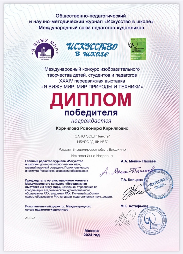Поздравляем победителей конкурса Корнилову Радомиру (преп. Нехаева И.И.) и Федяеву Варвару (преп. Слободянюк Е.А.), чьи работы были признаны лучшими и стали частью XXXIV передвижной художественной выставки.