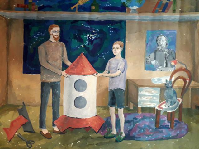 Второе место заняла работа обучающейся ДШИ №3 г. Владимира Анны Дерябиной «Моя первая ракета». В этой картине автор изобразил не космические дали, а обычную квартиру, в которой отец и сын строят ракету. Специальный приз от Русского космического общества - набор для живописи - за эту работу ей вручила председатель владимирского отделения этой общественной организации Ирина Лапшина. Призерам конкурса, в том числе и Анне, были вручены кубки победителей и призы Управления культуры и туризма администрации г. Владимира.