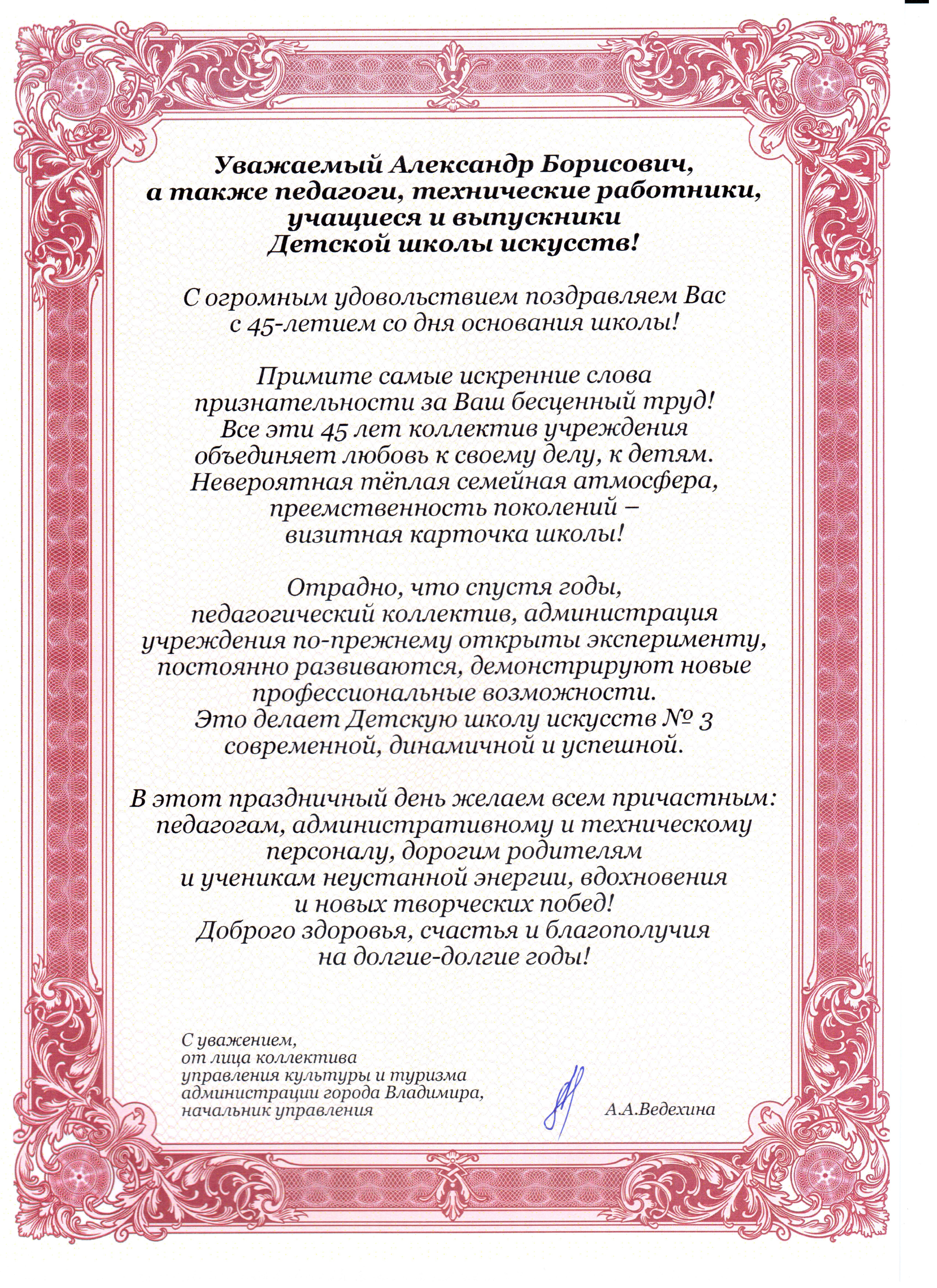 23 апреля в Концертном зале имени С.И.Танеева Владимирской областной филармонии состоится Отчетный концерт Муниципального бюджетного учреждения дополнительного образования «Детская школа искусств №3» города Владимира «И вновь мы приглашаем вас…», посвященный 45-летию школы. В концерте принимают участие солисты-инструменталисты, солисты-вокалисты, инструментальные ансамбли, хоровые и танцевальные коллективы, оркестры, являющиеся победителями международных, всероссийских, межрегиональных, областных и городских фестивалей-конкурсов. В программе концерта прозвучат музыкальные произведения различных стилей, эпох и направлений, а также музыкальные сочинения современных композиторов и обработки русских народных песен. На втором этаже Владимирской областной филармонии будет развернута выставка лучших работ обучающихся на художественном отделении школы, которая включает в себя графические и живописные работы, работы по декоративно-прикладному искусству и скульптуре. Будем очень рады видеть на нашем концерте родителей, дети которых обучаются в нашей школе, а также жителей города Владимира.
