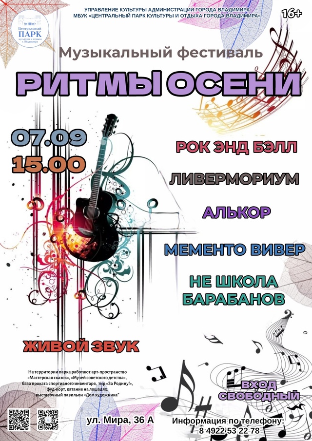 В эту субботу, 7 сентября с 15.00 Центральный парк культуры и отдыха г.Владимира станет точкой притяжения и единения людей, влюбленных в живой звук и неравнодушных к популярной музыке! Ежегодный музыкальный фестиваль «Ритмы осени» в очередной раз соберет всех тех, у кого в душе всегда звучат позывные гитарного рока. Независимо от того, зритель ты или артист.