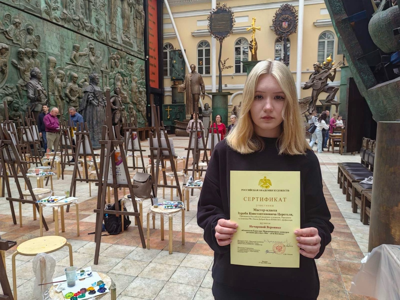 17 мая 2024 года ученица нашей школы Начарова Вероника (преп.Слободянюк Е.А.) приняла участие в мастер-классе художника-монументалиста, Президента Российской академии художеств З.К. Церетели, который проходил в Галереи искусств Зураба Церетели Российской академии художеств(г.Москва).