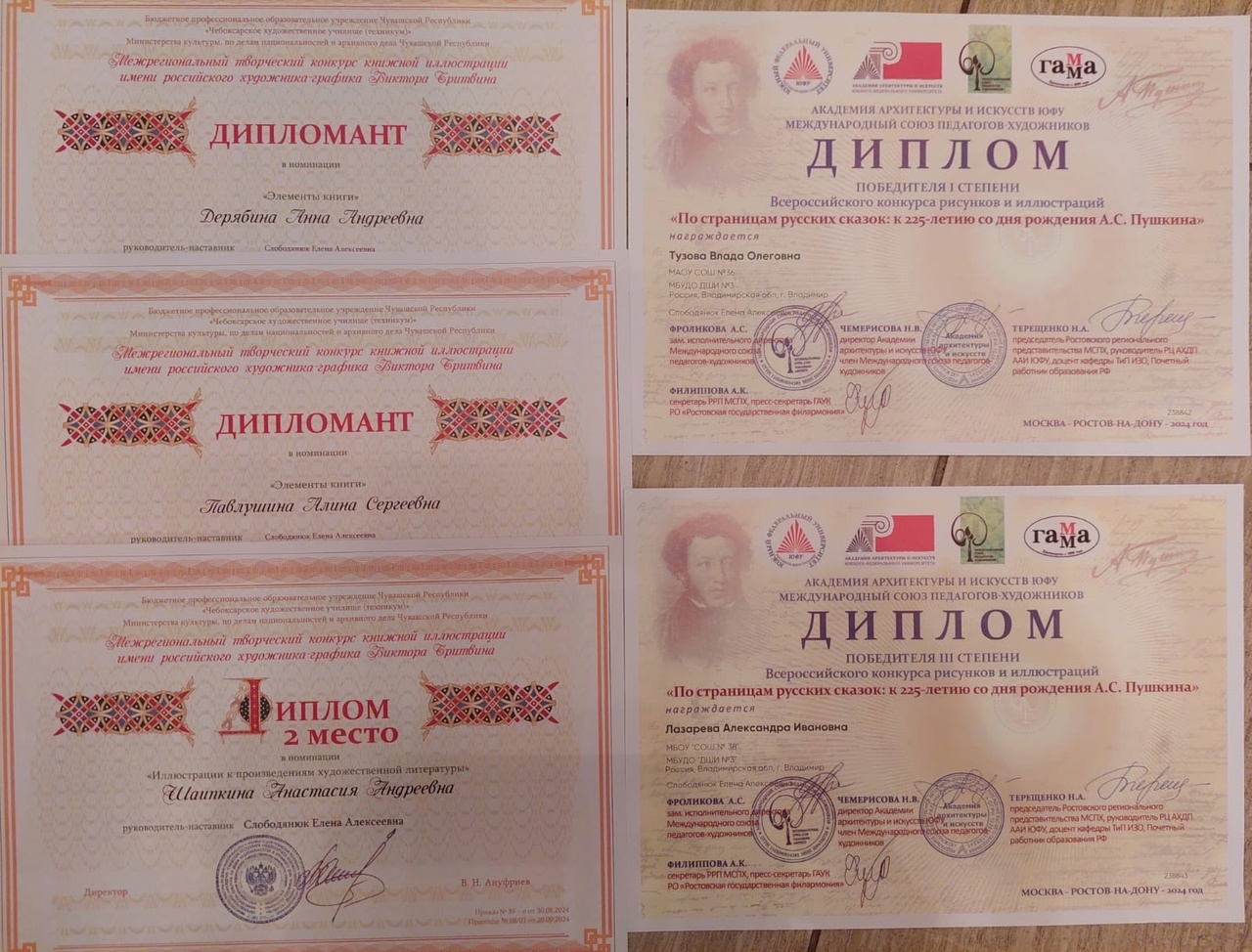 Во Всероссийском конкурсе рисунков и иллюстраций "По страницам русских сказок: к 225-летию со дня рождения А.С. Пушкина" ( г.Москва - г.Ростов-на-Дону) победителем 1 степени стала обучающаюся нашей школы Тузова Влада, Победителем 3 степени - Лазарева Александра.