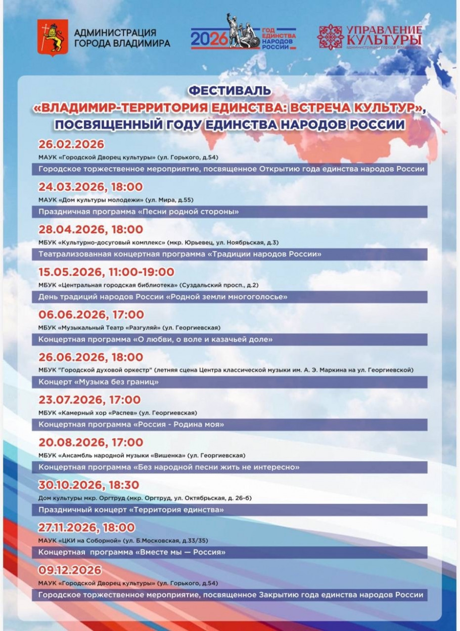 В 2026 году управление культуры администрации города Владимира проводит фестиваль «Владимир — территория единства: встреча культур», посвящённый Году единства народов России.
