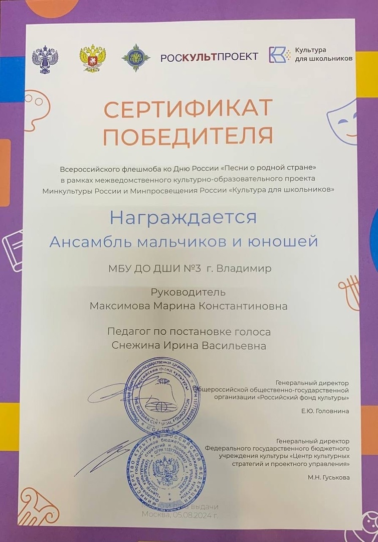 и Российского фонда культуры. Каждому участнику ансамбля в торжественной обстановке были вручены сумка, блокнот и ручка с надписями: «Культура для школьников» и «Культура начинается с тебя». Всегда приятно получать подарки! И особенно тогда, когда ты получаешь их не просто так, а в результате борьбы, соревнования, участия в конкурсе.