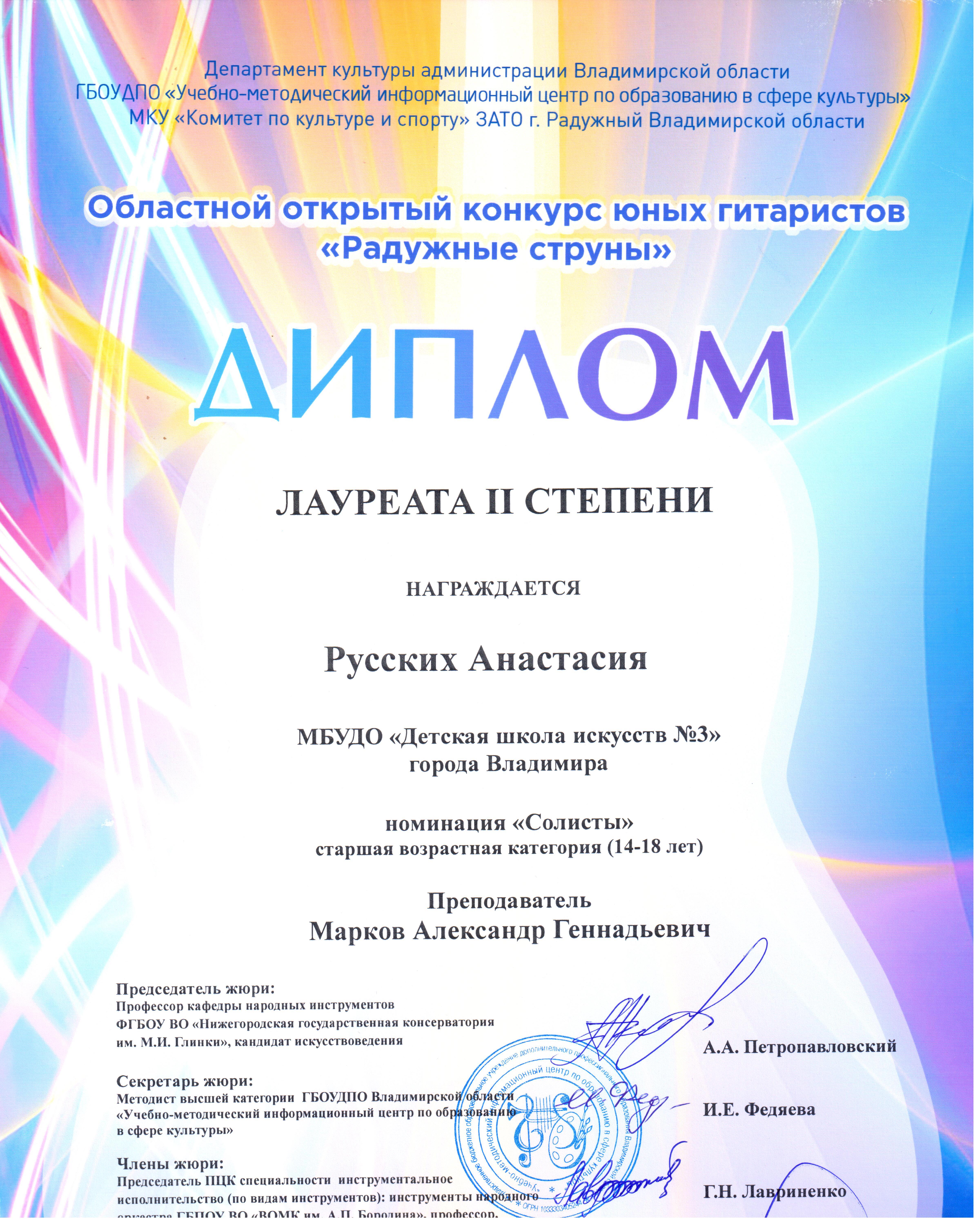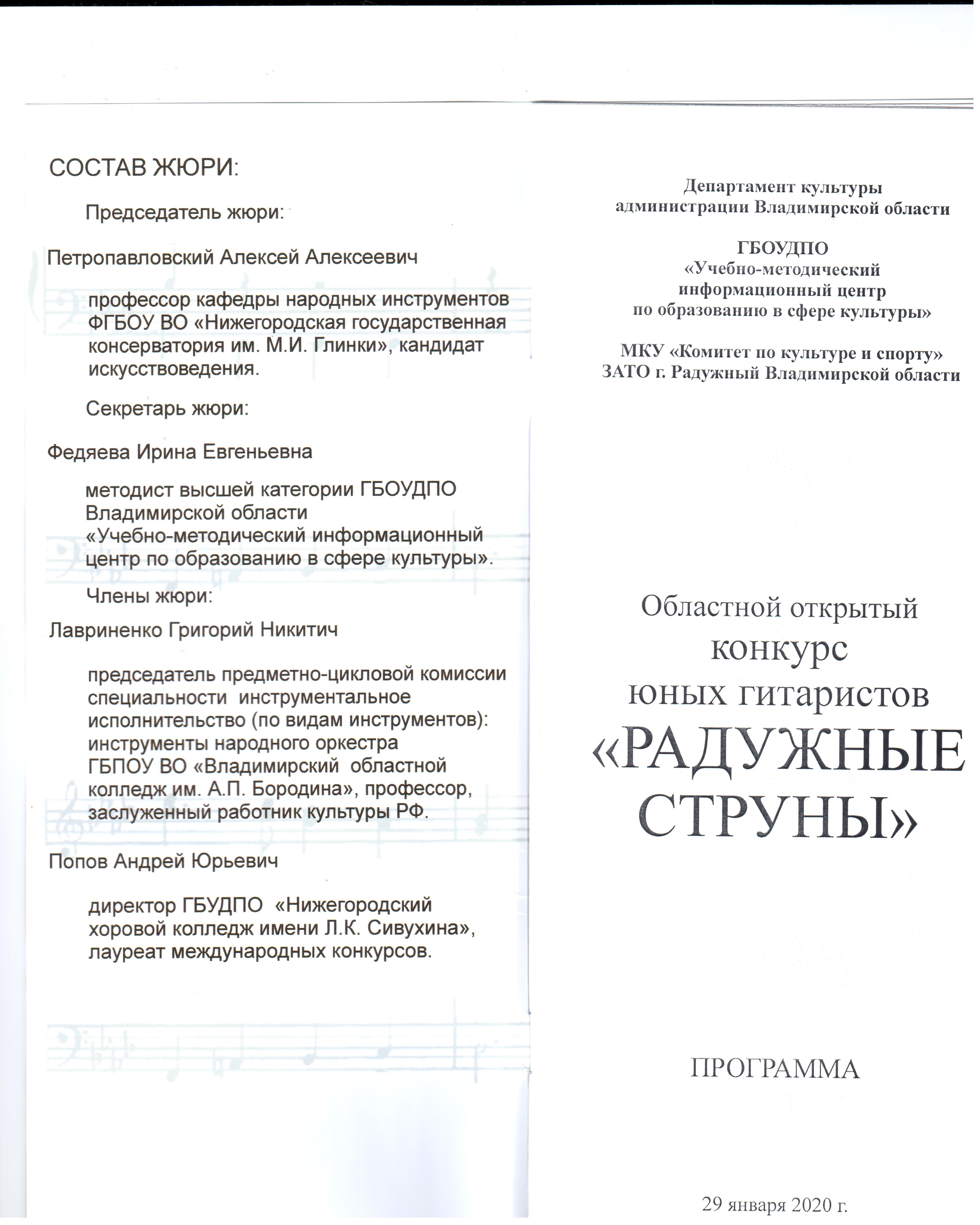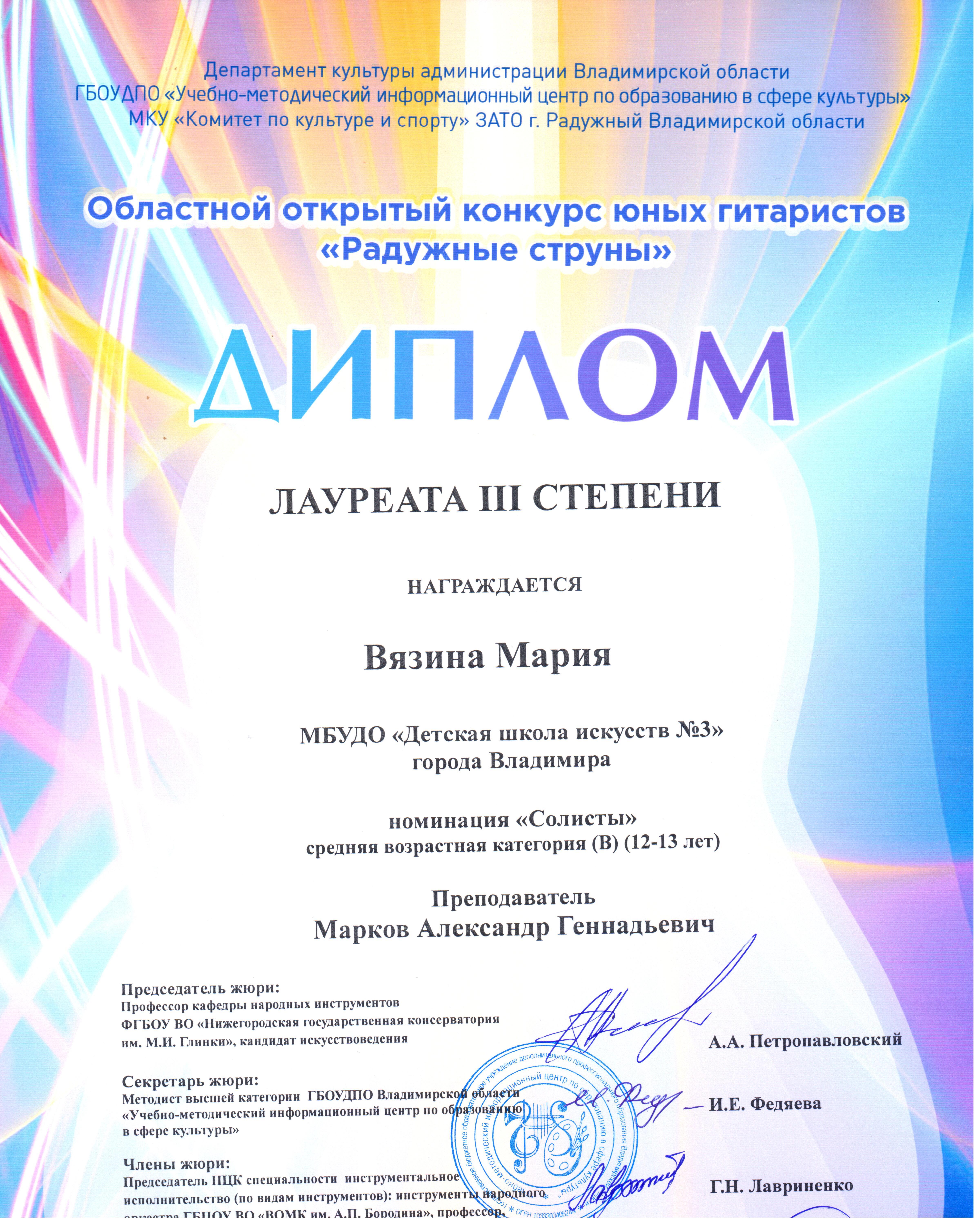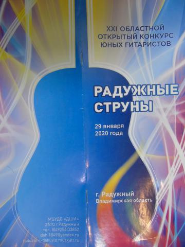 29 января в г.Радужный состоялся XXI областной открытый конкурс юных гитаристов. Конкурс проводился по следующим номинациям и возрастным категориям: номинация «Солисты» - младшая возрастная категория (до 9 лет включительно), средняя возрастная категория (10-11 лет), средняя возрастная категория (12-13 лет), старшая возрастная категория (14-18 лет); номинация «Ансамбли гитаристов», номинация «Педагого-ученик». В конкурсе приняли участие обучающиеся по классу гитары в ДШИ и ДМШ из городов Владимир, Вязники, Покров, Александров, Лакинск, Радужный, Гусь-Хрустальный, Муром, Петушки, Костерёво, Ковров, пос.Садовый. Всего 52 конкурсанта.