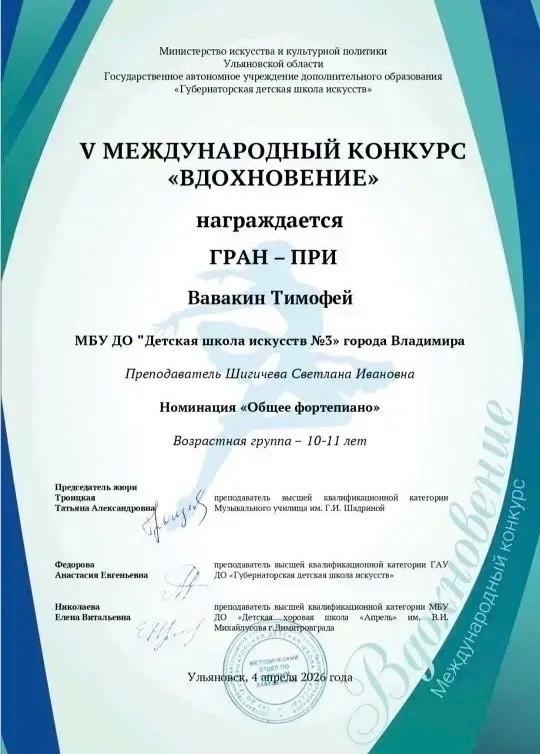 С огромным удовольствием делимся радостной новостью — ученик нашей школы Вавакин Тимофей стал обладателем Гран-при на V Международном конкурсе «Вдохновение»!